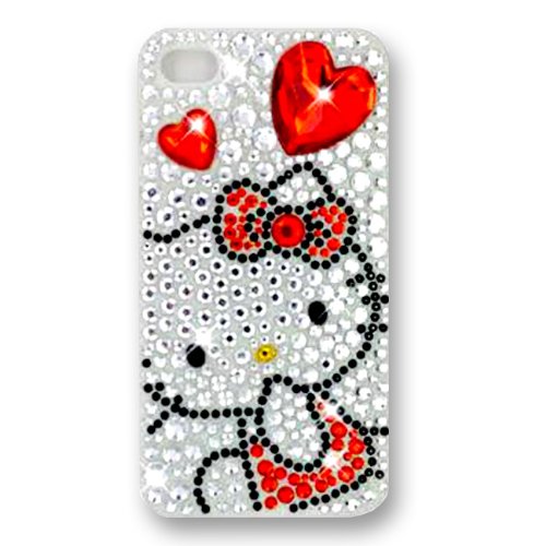 Hello Kitty with Red Hearts Diamond Rhinesontes Crystal Jewerly Protector Snap On Case Cover for iPhone 4S - Includes a Bonus Screen Protector and TWO Bonus Personal Charm Straps ![]()